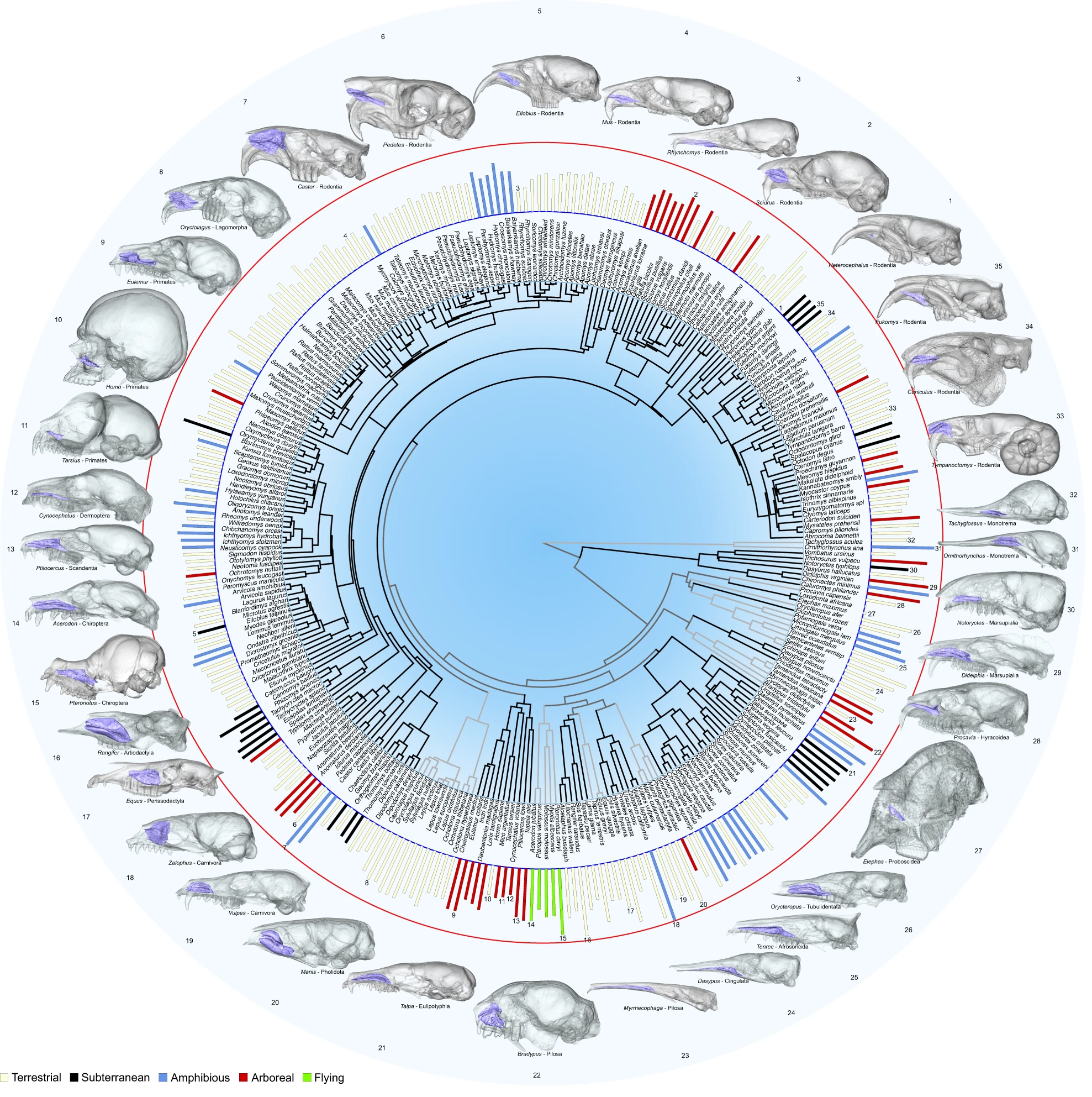 裸鼹鼠(异头鼠属)头骨和上颌骨的三维图像;左)和加州海狮(Zalophus californianus)...