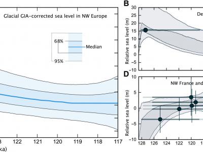 欧洲西北部的LIG海平面高站。(A)在考虑长期变形和冰川GIA后,欧洲西北部的LIG海平面...