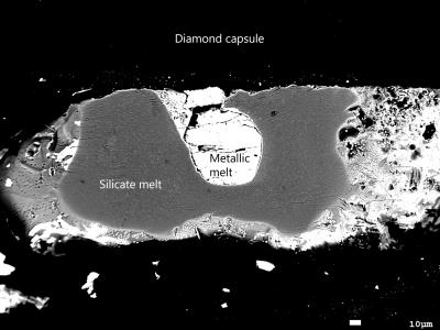 图像中心的明亮区域显示淬火的金属熔体,周围的灰色区域表示淬火的硅酸盐熔体。样品...