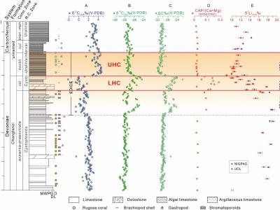图1 四川龙门山泥盆系-石炭系界线剖面δ13Ccarb和δ13Corg记录、CAP含量和δ7Li记录...
