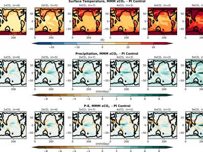 根据工业化前的水平,模拟平均地表温度、降水量和降水-蒸发预算,直至二氧化碳水平...