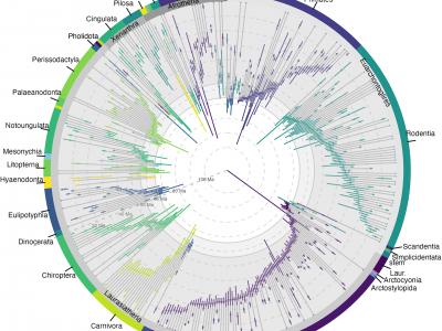 胎盘哺乳动物家族的进化枝年龄和灭绝时间估计。每条线代表一个科(按目和分支排列,...