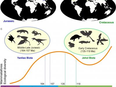 显示侏罗纪和白垩纪早期哺乳动物祖先分布的古地理图,以及哺乳动物多样性随时间变化...