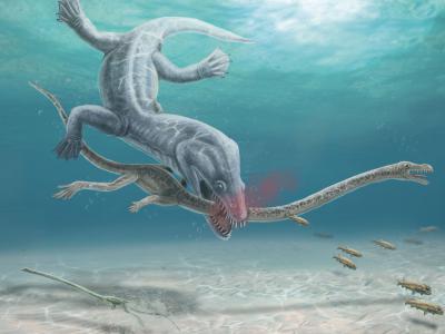 Tanystropheus hydroides被斩首场景的艺术演绎。图片来源:Roc Olivé(加泰罗尼亚...