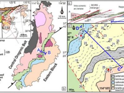 图1.沉积岩层序所在地区地质图。(a)研究区位于华北克拉通中部造山带和东部陆块交界...