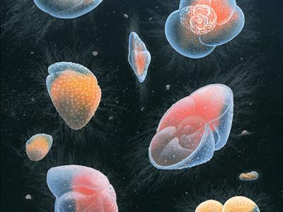 对现今漂浮在深海中的浮游有孔虫的描述。Credit: Richard Bizley, BizleyArt.(化石...