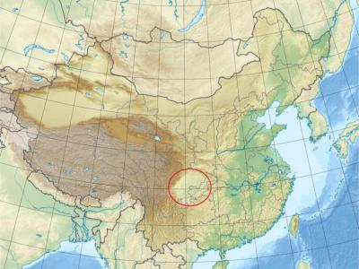 突出显示四川盆地的中国地形图。Credit: Uwe Dedering/Wikimedia Commons, CC BY-S...