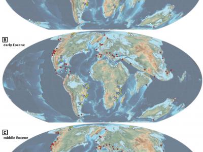 (A)古新世、(B)早始新世和(C)中始新世位置,包括有和没有记录的富砂深海系统的位置...