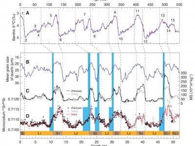 图1 黄土磁化率、粒度和次生碳酸盐锶同位素与底栖有孔虫氧同位素对比图图2 55万年以...
