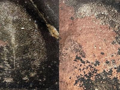 最初看起来像狄更逊水母化石的东西(左边)在短短几年内就已经腐烂并开始从岩石上剥...