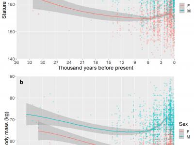 带有Lowess线的散点图说明了(A)身材变化的广泛模式,说明了超过30 kya的普遍下降...