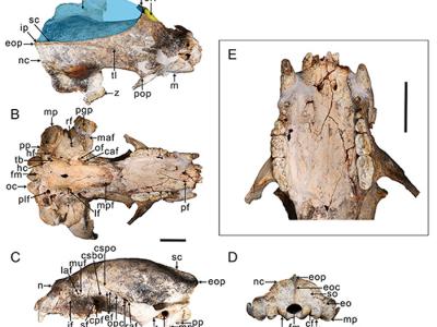 一块哺乳动物头骨化石,牙齿窝里的沉积物,原来是史前蜜蜂筑的巢穴。图片来源:拉萨...