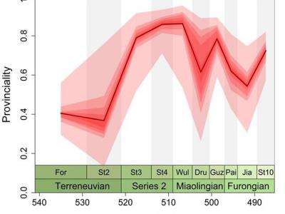 图1 寒武纪生物古地理地区性指标(PIE)的变化曲线(PIE值越高,表明地区性越强)图...