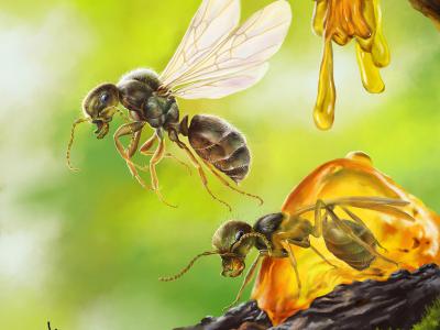 吉蚁婚飞场景复原图(刘野/绘)琥珀中的吉蚁雌性繁殖蚁样本(庄宇辉/摄)吉蚁样本头...
