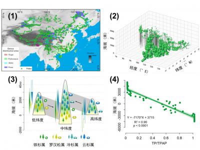 图1. (1) 现代大空间3088个表层样品孢粉中四类孢粉与母体植物(铁杉属、罗汉松属、冷...