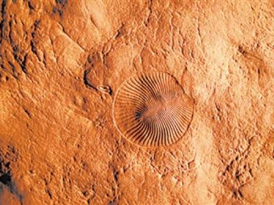 南澳大利亚尼佩纳·埃迪卡拉国家公园砂岩中的埃迪卡拉纪化石狄更逊水母(中)与较小...
