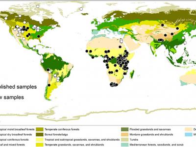 偶蹄目牙釉质样品的地理分布。样品数量=1366。偶蹄目动物碳同位素数值在系统发育树...