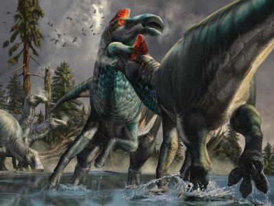 两只雄性埃德蒙顿龙为了争夺交配权打斗,图中可见它们被趾甲覆盖的似蹄前脚。ILLUS...