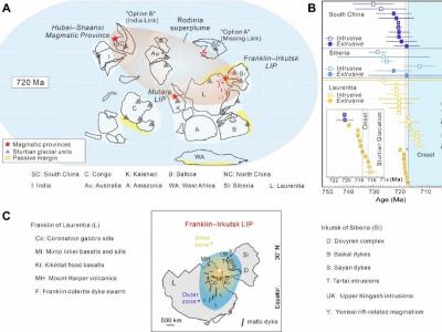 司图特冰期记录和7.2亿年前岩浆岩省的古地理分布、相关地质年代学数据总结,以及富...