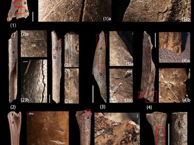鸟类骨骼表面的切割痕迹 (123ab,4b,567a)、劈裂痕迹(4a)及刮削痕迹(2cd)。鸟类骨...