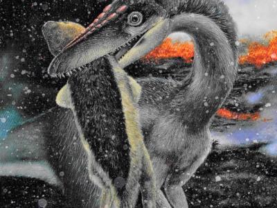 雪天中吃哺乳动物的有羽毛的兽脚亚目恐龙。图片来源:Larry Felder晚三叠世准噶尔盆...