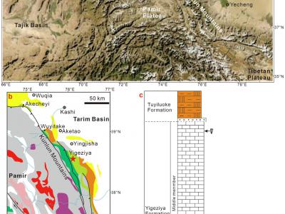 a. 中亚产出晚白垩世双壳类固着蛤的塔里木盆地及周边盆地的地理位置;b. 塔西南地质...