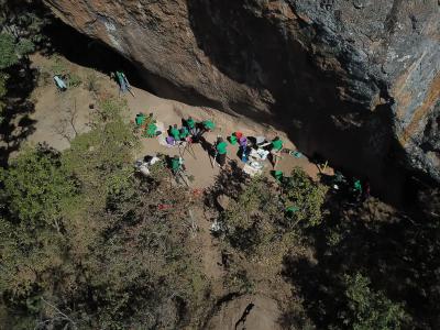 图为Grotte Mandrin岩棚的考古发掘工作。这里出土了石器、动物骨骼与古人类牙齿。图...