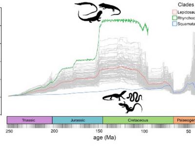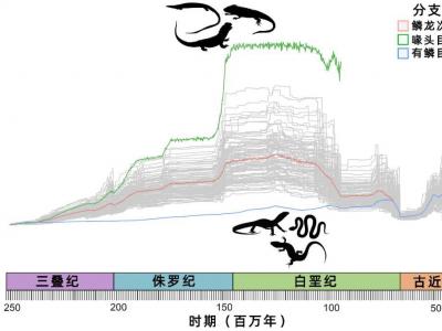 在大约2亿年的时间里,蜥蜴和蛇(有鳞目)的进化速率(蓝)远低于喙头目(绿)的进...