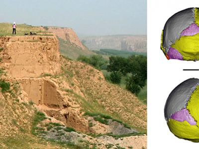图1. 许家窑人遗址(左)及其发现的古人类化石复原头骨(右)图2. 许家窑人头骨化石...