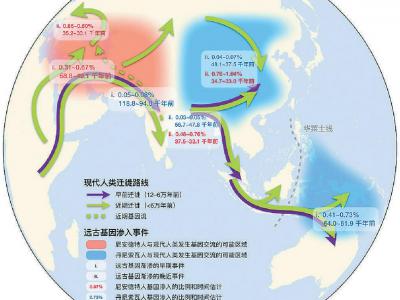 现代人类史前迁徙路线及其与远古人类的基因交流模式示意图(化石网报道)据北京日报...