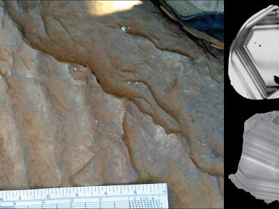左图:砂岩地层(用尺子表示);右图:锆石颗粒(显微图像)花岗岩浮力岩(化石网报...