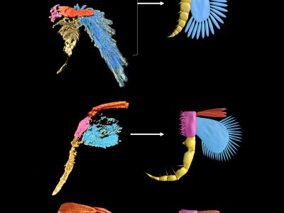 插图一:左侧为使用显微CT及三维复原技术从化石中提取的4个澄江节肢动物物种的腿肢...