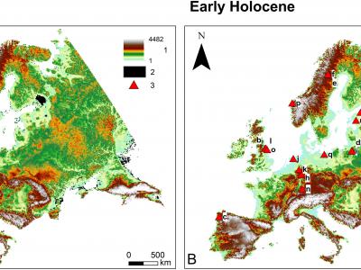 LIG (A) 和全新世早期 (B) 研究区。图例:1–海拔(以米为单位,m.a.s.l.);2–...