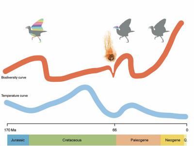 鸟类生物多样性演化和气候及白垩纪末大灭绝事件的关系示意图(任名卉绘)鸟类和恐龙...