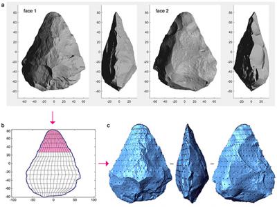 手斧类工具三维几何形态测量分析的部分流程—定位(a)与自动布设标志点(b, c)远...