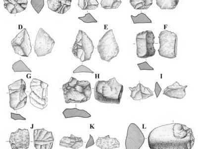 楼房子遗址出土主要石器类型的线图(A:盘状石核;B、C:锯齿刃器;D、E: 刮削器;...