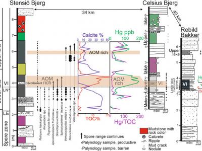 东格陵兰地区泥盆纪-石炭纪界线地层剖面(Stensio Bjerg、Celsius Bjerg及Rebild B...