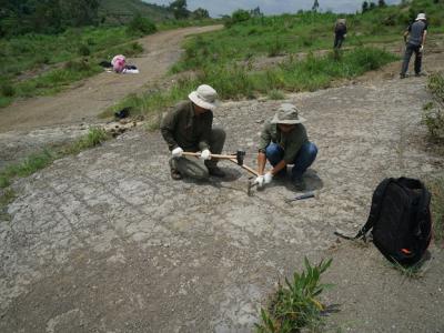 南京古生物所泥盆系工作团队成员在云南盘溪地区采集化石样品现场工作图云南盘溪中-...