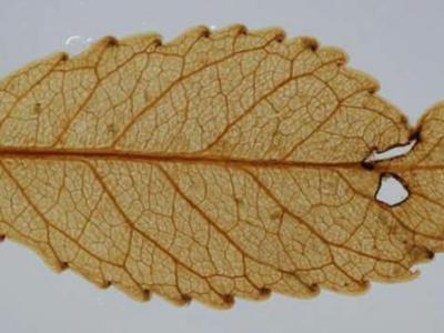 2300万年前的叶子,仍然可以看到纹理,被昆虫咬破的洞和疤痕结构。图中是高度放大的...