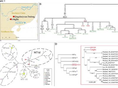 清水苑大洞及广西隆林人线粒体遗传信息分析。(a).清水苑大洞及广西隆林样本地理位置...