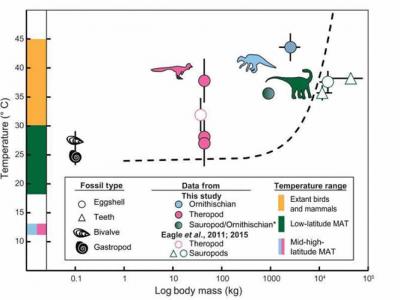 目前已经完成测温的恐龙体温和它们体型(x轴)以及生存环境温度(y轴)之间的关系(...