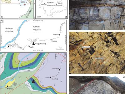 云南万和剖面交通位置图与地质背景,其中E和F示意斑脱岩层的野外照片(化石网报道)...