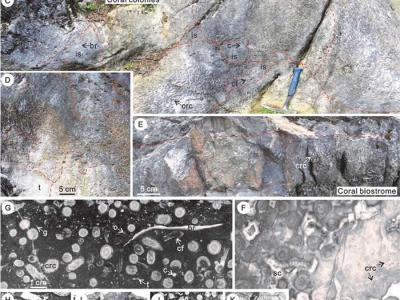 华南密西西比亚纪维宪晚期珊瑚礁野外(A-E)、光面(F-G)和薄片(H-P)图片全球其...