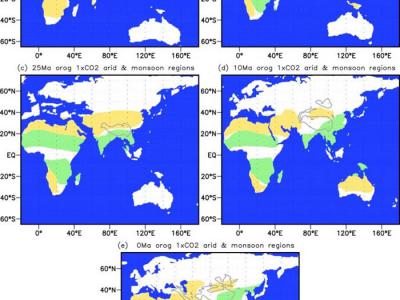 新生代5个时期亚-非-澳洲季风区(绿色阴影)和干旱区(黄色阴影)...