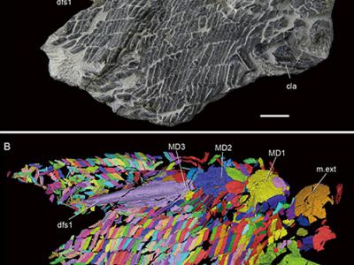 A,梦幻鬼鱼鳞列标本;B,梦幻鬼鱼鳞列标本三维复原。(崔心东供...