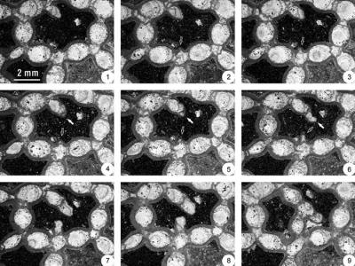 Halysites catenularius中通过侧分芽产生出新的珊瑚个体(箭头...