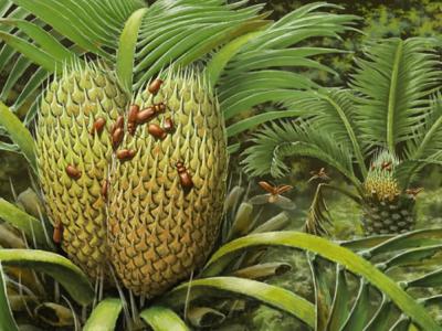 白垩纪中期喜苏铁白垩似扁甲的生态复原图白垩纪中期喜苏铁白垩...