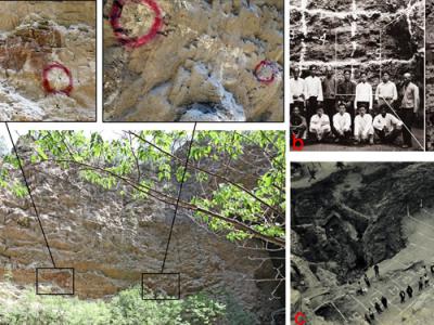 周口店遗址第1地点洞壁保留的探方和水平层痕迹及遗址发掘平面...