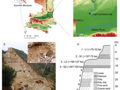 大荔人遗址地理位置(A、B)、地貌(C)、地层和年代(D、E)...