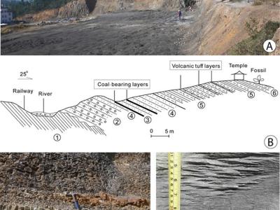 云南省南华县吕合镇化石点地层概况(C中的箭头所指...